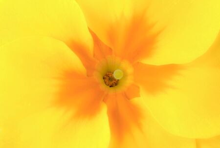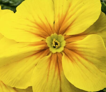 Closeup of a vibrant yellow primrose, primula with an orange center.