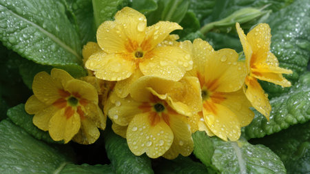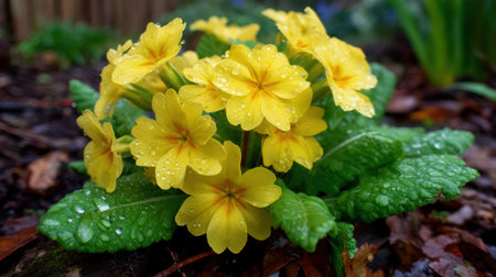Soft rain falling gently on Polyanthus, with water droplets forming and slowly dripping. The background is softly blurred with a natural, moody atmosphere.