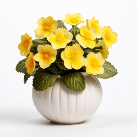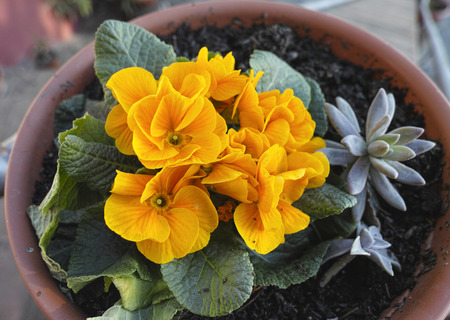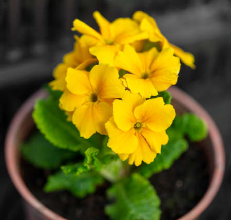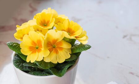 Pot of primulas primroses, yellow vibrant flowers, plants in home