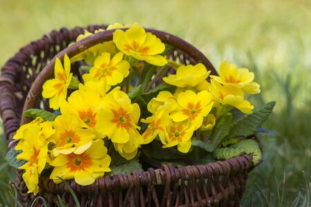 Perennial yellow primrose or primula in the spring garden.