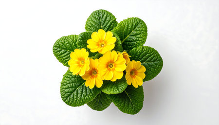 Yellow primrose in a pot, close-up with green leaves, top view. Bright spring flowers as a gift