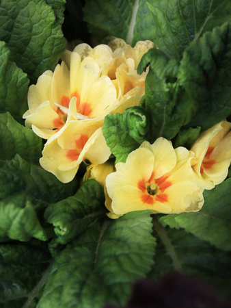 Yellow primrose flowers with green leaves close up macro photo