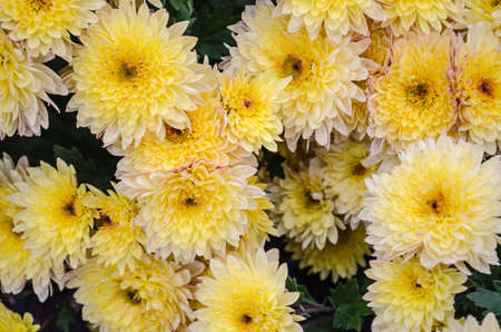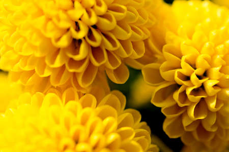 Yellow chrysanthemums bloom close - up flat lay. Background of autumn flowers in bright sunlight. Soft focus, top view copy space flower composition. Natural autumn background. Mother's Day Concept