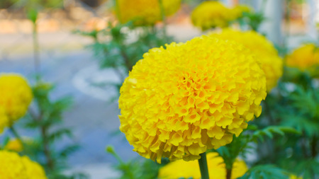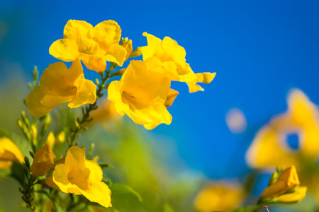 Cute yellow flowers that bloom in relax time receive the light of the sunshine on the morning of spring with a blue sky background