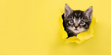 Cute tabby kitten peeking through a torn hole in bright yellow paper, playful peekaboo expression with head emerging, perfect for banners, copy space and joyful pet concepts