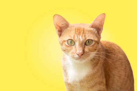 The cat sits calmly and looks confidently at the camera, cat isolated on a yellow background. Portrait of a pet. Animals children with interest, questions, facial expressions.