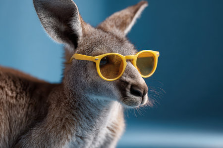 Kangaroo wearing yellow sunglasses against a vibrant blue background enjoying a playful moment in a sunny setting