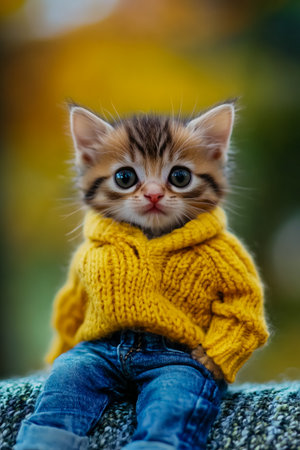 This adorable cat is sitting upright with its head held high against a vibrant yellow background, exuding a sense of curiosity and charm. Perfect for animal lovers!