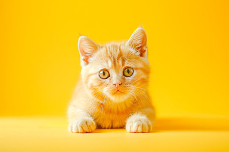 Adorable Ginger Kitten with Big Eyes Posing on Bright Yellow Background Cute Feline Portrait, Pet Photography AI Generative