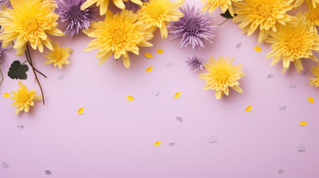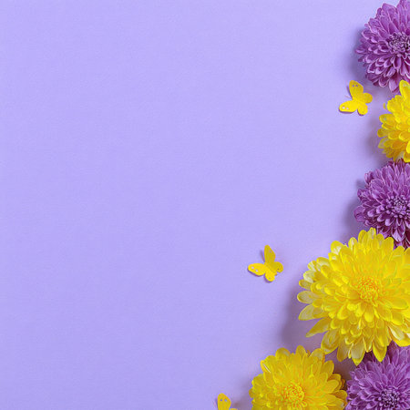 An image showcases a floral arrangement composed of yellow and purple chrysanthemum flowers and small butterfly decorations on a light purple backdrop. The composition is brightly lit, with a smooth texture and a simple layout. The scene could be used in design projects, advertisements, or editorial content.