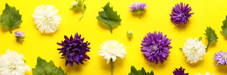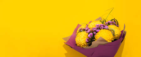 Banner with lush chrysanthemums bouquet on bright yellow background with copy space, empty text place. Flower shop certificate. Holiday greeting card Valentine and Mother day, International Woman Day.