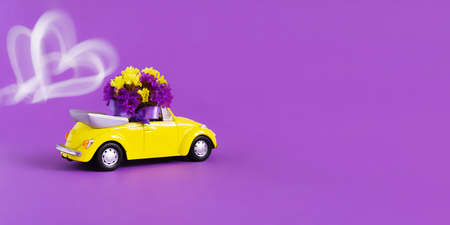 View of a yellow convertible car with a bouquet of flowers on a purple background behind which a train of a white heart develops. Concept holiday, delivery, art, background, transport