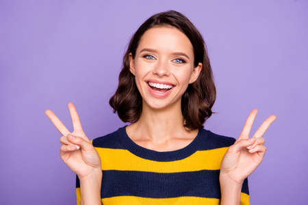 Close up photo beautiful amazing she her lady arm hand fingers raised v-sign symbol say hi relatives friends peaceful nice person wear blue yellow striped pullover isolated violet purple background