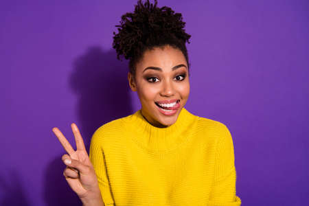 Close up photo of carefree lady make faces v-signs wear bright jumper sweater laughing isolated over violet purple background