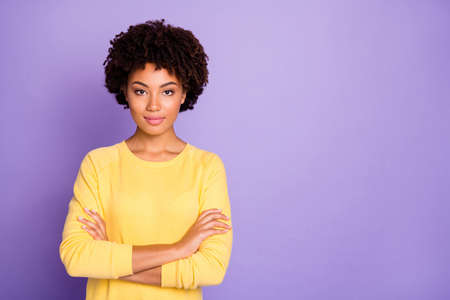 Portrait of her she nice attractive lovely charming content peaceful calm wavy-haired girl folded arms isolated over violet purple lilac pastel color background