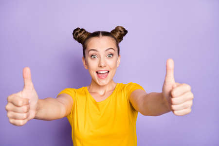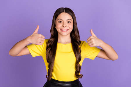Photo of pretty teenager lady raising thumbs up expressing agreement and positive attitude wear yellow t-shirt isolated on pastel purple background