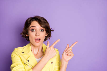 Photo of nice optimistic brunette hairdo girl point empty space wear yellow t-shirt isolated on vivid lilac color background
