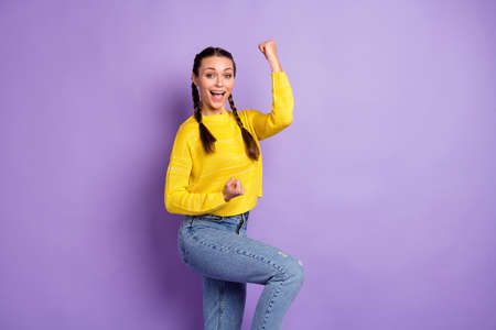 Profile portrait of astonished pretty person fists up open mouth celebrate raise knee isolated on purple color background