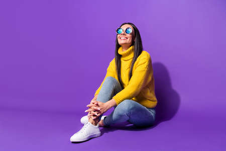 Full length portrait of pretty positive girl sit beaming smile enjoy free time isolated on purple color background