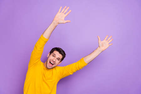 Photo of carefree cheerful male raise fists in victory successful triumphant win prize isolated on violet color background