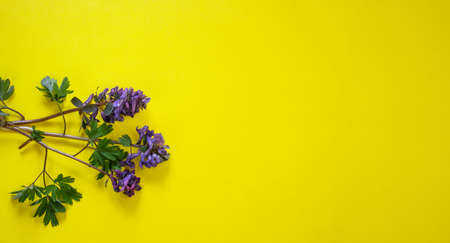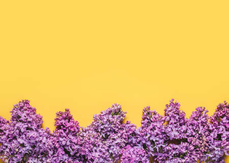 Lilac. A branch of purple lilac on a yellow background. Lilac blooming view from above. Spring, Plants and botany have come. Lilac is located on right. Banner. Panorama. Flatly. Copy space for text
