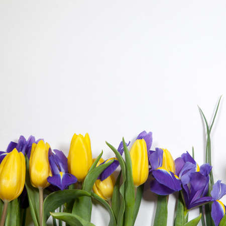 violet Irises xiphium (Bulbous iris, Iris sibirica) with yellow tulip on white background with space for text. Top view, flat lay