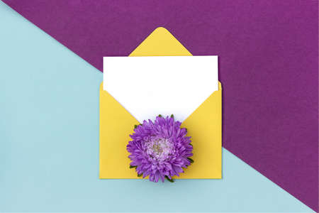 White blank card, yellow envelope and purple flower on blue background. minimal style. Top view Flat lay Mockup.