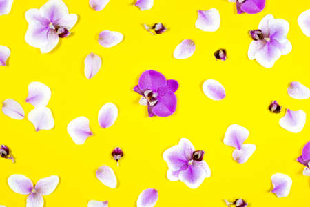 Modern abstract closeup of purple orchid flower pattern on yellow background. Tropical floral repeat pattern. Trendy wedding nature garden backdrop decoration. Beautiful summer, spring fashion print.