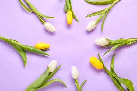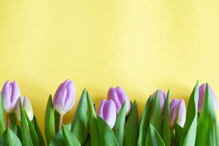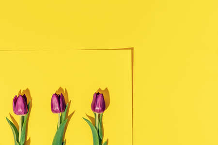 Creative layout made of spring tulip flowers on yellow paper background, copy space