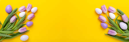 Banner with flowers and easter eggs on a purple pastel background. Holiday creative concept.