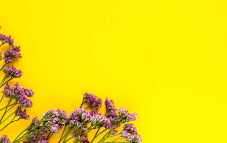 Border made with purple flowers on yellow background. Concept Spring or Summer backdrop. Template for design, greeting card, invitation, postcard Flat Lay Top view Copy space.
