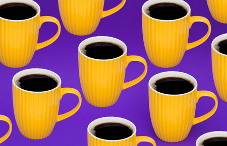 A cup of coffee, a yellow camera and a cassette with a magnetic tape on a purple background. Color trend. Stylish accessories. Flat lay.