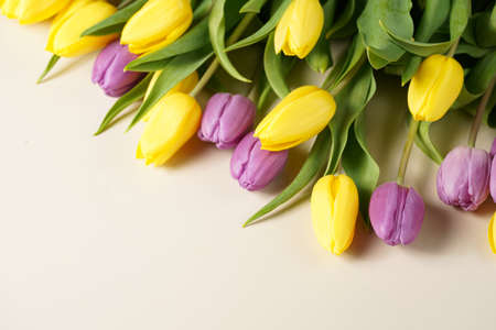 A bunch of yellow and purple tulips on a beige colored background, copy space for text