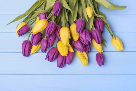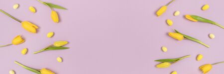 Spring floral banner with multicolored tulips on yellow background. Top view. Copy space