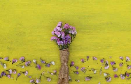 Summer Dried Flowers on Yellow Background. Minimalist flat lay background for mock-up template.