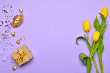 Yellow tulips on a purple background, soft focus. Postcard, congratulations for women.