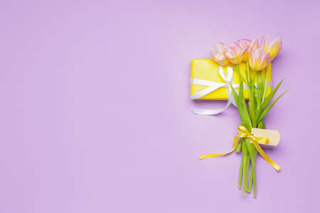 Beautiful greeting card with place for text, copy space - yellow tulips flowers and gift box with ribbon. Mothers day, birthday, anniversary