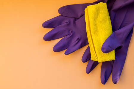 Cleaning equipment - gloves, sponge and rags on pastel background. Purity concept.purple rubber glove with microfiber cloth.regular cleanup. Commercial cleaning company. Copy space.
