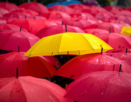 Amidst a multitude of red umbrellas, one bright yellow umbrella catches the eye, speckled with rain.