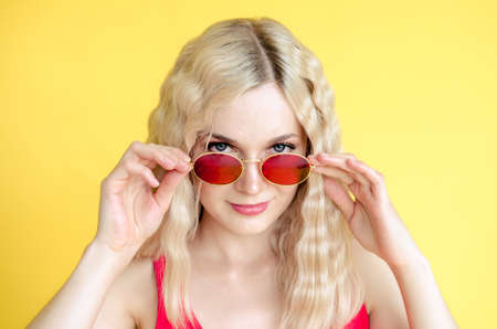 A beautiful young girl wearing red sunglasses stands near a yellow background