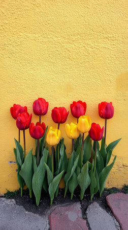 A pot of striking red and yellow tulips stands against a bright yellow wall, bringing warmth and liveliness to the area. The flowers are arranged neatly, casting a gentle shadow.
