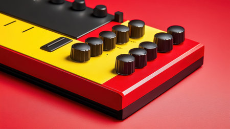 A striking electronic music synthesizer featuring colorful knobs and buttons, positioned against a bold red backdrop, perfect for creative projects.