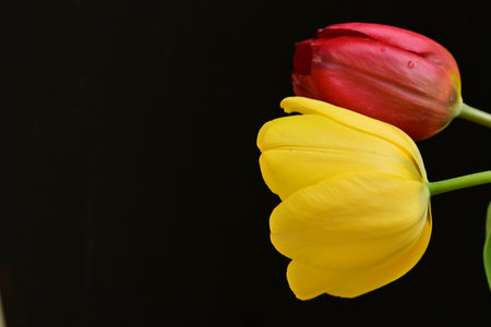 Yellow and red tulips on black background with copy space for text