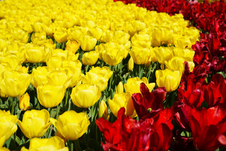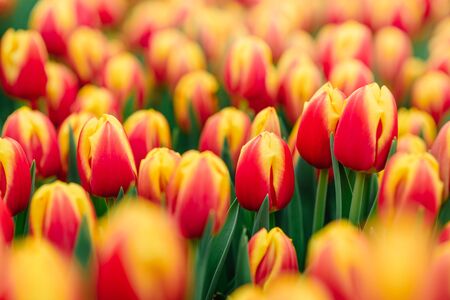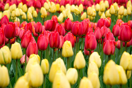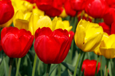 Plantation of blooming yellow and red tulips, closeup.