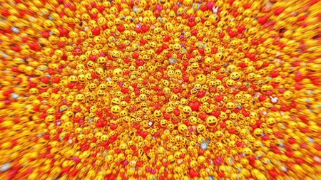 This overhead shot presents a dense collection of emoji faces, primarily yellow, with diverse expressions. The composition features a repeating pattern suggesting a vibrant, cheerful mood. The image employs soft lighting, possibly indoors, suitable for commercial projects related to communication and emotions.