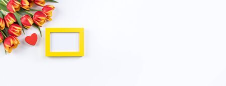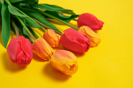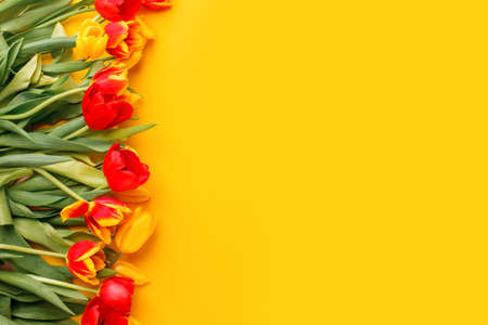 Yellow red tulips on yellow background. Seasonal Spring Holiday poster with free text space, greeting card, banner, flyer. Minimal concept of Hpayy Esater, Mother day, 8 march, Woman day, birthday
