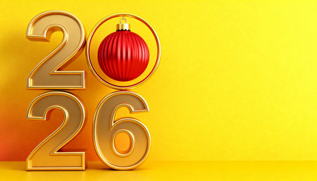 A 3D rendering of the year 2026 in gold with a festive red Christmas bauble replacing the zero. The scene is set against a vibrant yellow background with copy space.