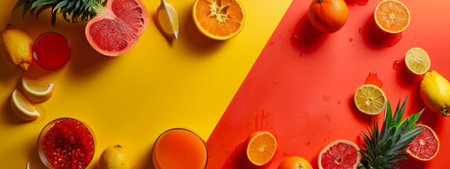 A colorful flat lay of citrus fruits arranged on a split yellow and red background, creating a vibrant and fresh scene ideal for summer and food-related themes.