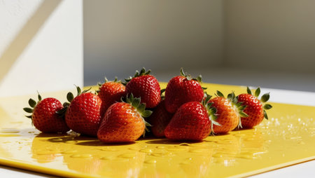 AI Generated. Strawberries on a yellow surface with water droplets