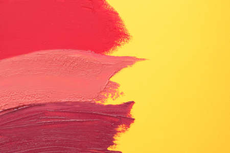 Smears of different beautiful lipsticks on yellow background, top view. Space for text